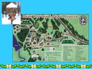 Документ описывает новогоднее путешествие в вотчину Деда Мороза в Великом Устюге, где расположены его дом, почта и аттракционы для туристов. Важными событиями являются День рождения Деда Мороза, который отмечается 18 ноября, и возможности для гостей поучаствовать в различных сказочных приключениях. Традиционный облик Деда Мороза и Снегурочки также подробно описан, включая особенности их костюмов и символику.