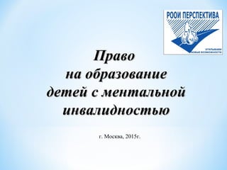 Документ описывает право детей с ограниченными возможностями здоровья на образование в России, основываясь на международных и национальных законодательных актах, включая Конвенцию о правах инвалидов и Федеральный закон об образовании. Он подчеркивает необходимость инклюзивного образования и специальных условий для обучения таких детей, а также роль родителей и педагогов в организации образовательного процесса. В документе также представлены меры поддержки, включая адаптированные программы и психолого-медико-педагогическую помощь.
