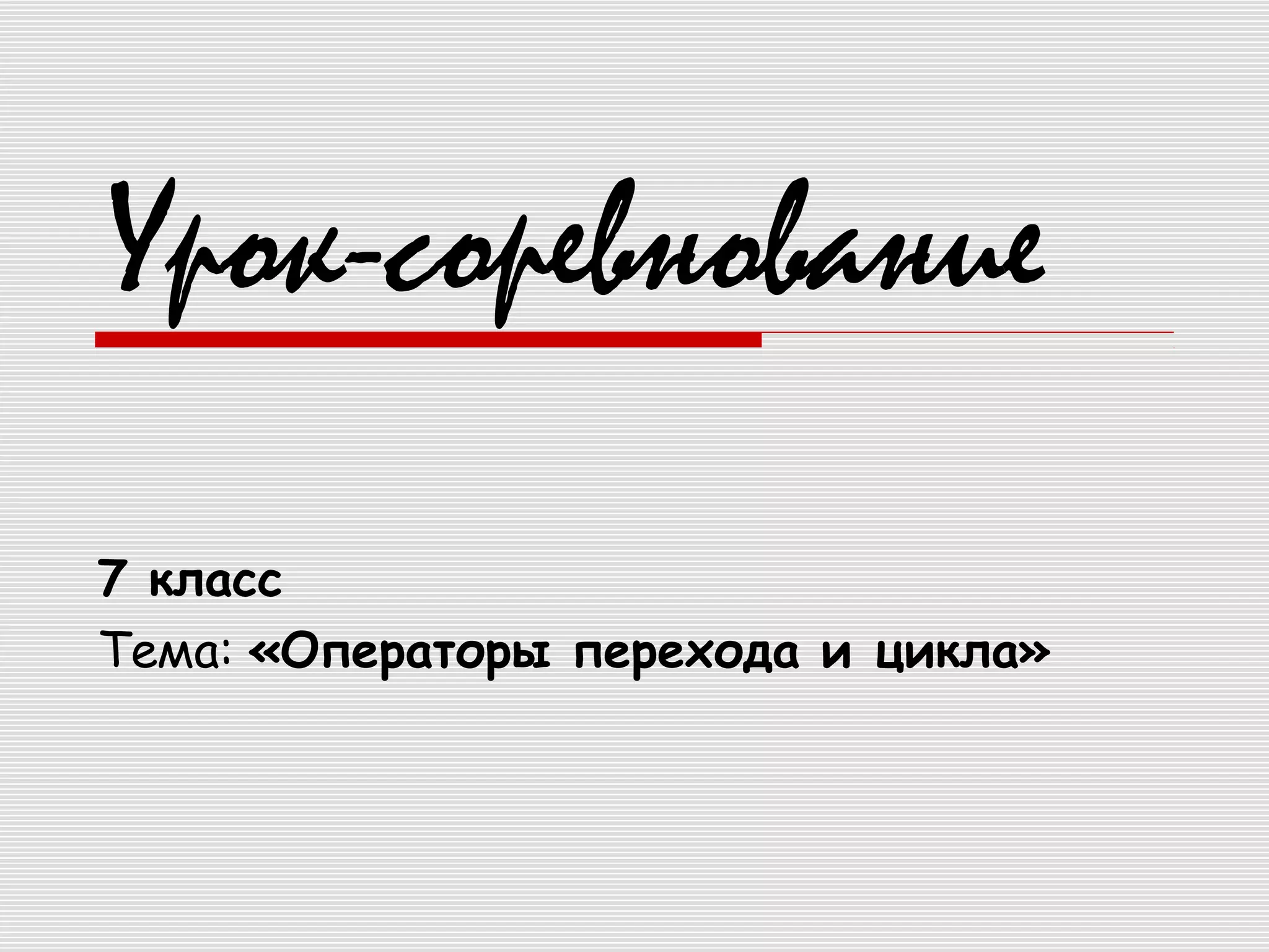 Документ представляет собой инструкцию для урока-соревнования по программированию для 7 класса, охватывающую темы операторов перехода и циклов. Включает различные конкурсы и задания, где команды решают задачи, используя программирование, а также физкультминутки. Итоговые результаты соревнования подводятся с указанием мест участников.