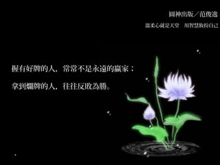 文档讨论了人们常常羡慕他人的外表和财富,但真实的成功往往源于个人的内在智慧和努力。作者通过女作家的故事强调了弱点可能转化为动力,实现逆转。最终,文档传达了一个观点:拥有好牌的人不一定是赢家,而那些面对挑战的人,往往能因其经历而更加成功。