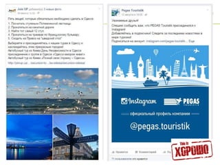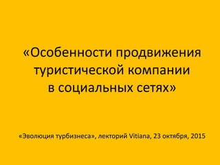 Документ описывает стратегии продвижения туристической компании в социальных сетях, подчеркивая важность SMM для повышения трафика, управления репутацией и коммуникации с клиентами. Основные задачи включают анализ конкурентов, создание концепции, разработку контент-плана и использование таргетированной рекламы. Акцент делается на взаимодействии с клиентами через интересный контент и работу с лидерами мнений для увеличения вовлеченности аудитории.