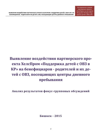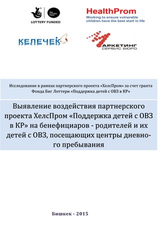 Исследование проекта «Хелспром» показало положительное воздействие дневных центров для детей с ОВЗ в Кыргызстане на развитие и адаптацию детей и их родителей. В ходе фокус-групп были выявлены значительные улучшения в навыках самостоятельности, социальной активности и уверенности у детей, как результат посещения центров. Несмотря на высокий уровень удовлетворенности и улучшение доступа к базовым услугам, остаются проблемы с информированием и доступом к услугам в удаленных регионах.