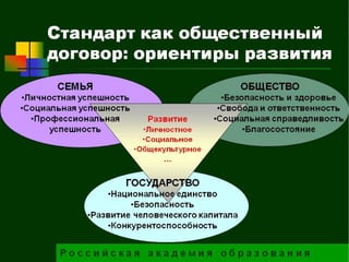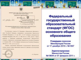 Документ описывает федеральный государственный образовательный стандарт основного общего образования в России, основной целью которого является повышение качества образования и создание условий для развития личности. Стандарт вводит системно-деятельностный подход, акцентируя внимание на универсальных учебных действиях и индивидуализации образовательного процесса. В документе также выделены изменения в учебных планах, образовательных технологиях и требованиях к результатам обучения.