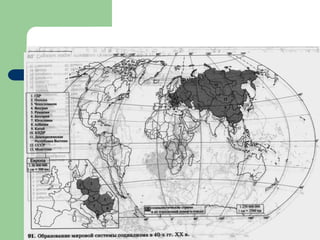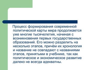Документ анализирует эволюцию политической карты мира с древности до современности, разделяя историю на ключевые эпохи: древний мир, средние века, новую историю и современность. Он также обсуждает проявления непризнанных государств, их происхождение и влияние на международные отношения, а также характеристику различных форм правления и государственных устройств. В документе подчеркивается значимость изменений на политической карте, связанных с революциями, колониальными империями и современными этнотерриториальными конфликтами.