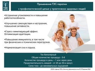 Документ описывает применение ТЭС-терапии для профилактики у здоровых людей, направленной на улучшение работоспособности, самочувствия и стресса. Терапия включает 5-8 процедур с биполярным током, каждая из которых длится 20-30 минут. Основные цели - повышение иммунитета, нормализация сна и адаптация к физическим и психическим нагрузкам.