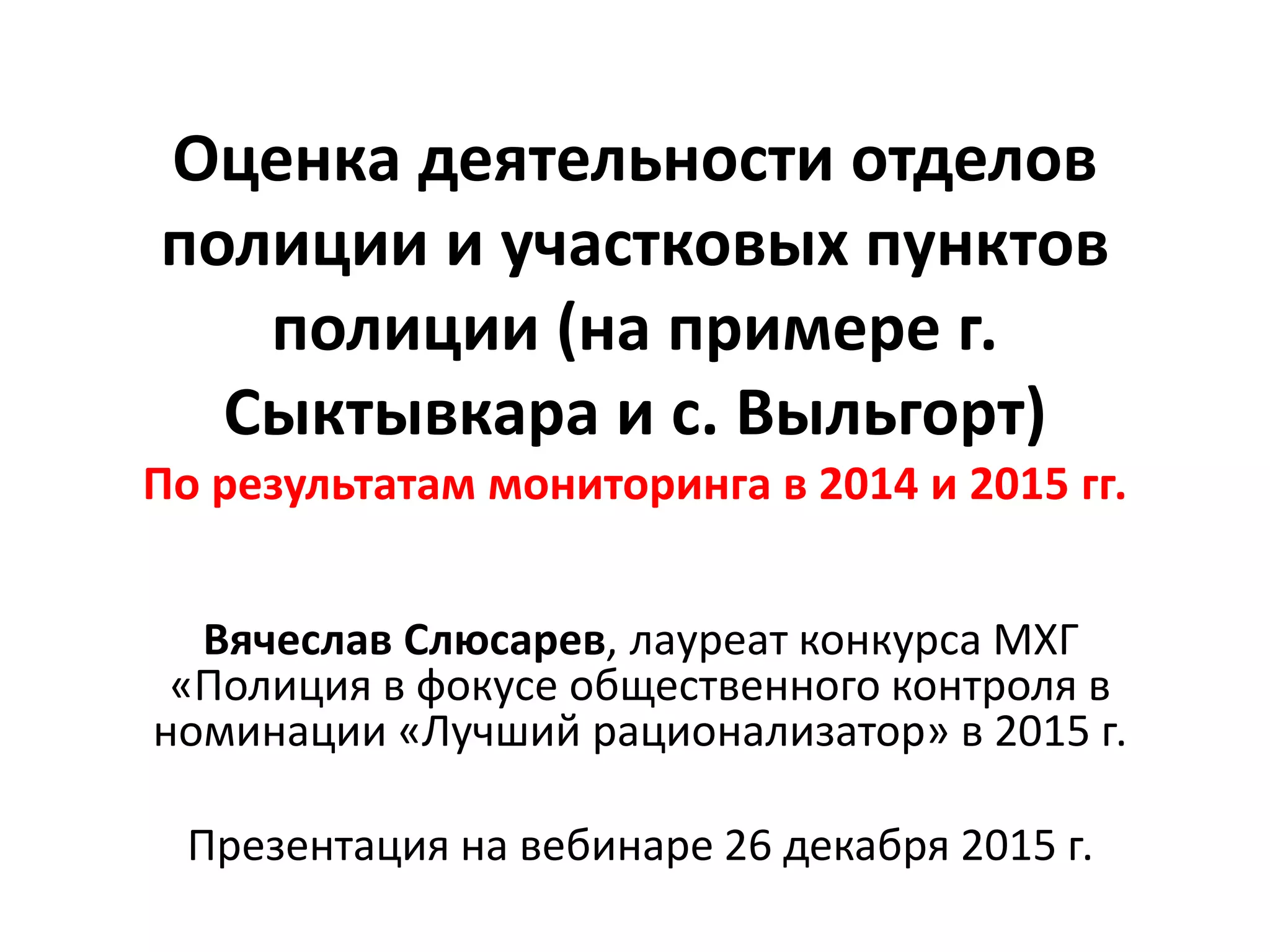 Документ представляет результаты мониторинга деятельности участковых пунктов полиции в г. Сыктывкар и с. Выльгорт за 2014 и 2015 годы. Основное внимание уделяется оценке работы участковых и общим проблемам, выявленным в процессе оценки, с применением пятибалльной системы. Рекомендации для 2016 года включают необходимость пересмотра методов оценки и улучшения доступа к информации.