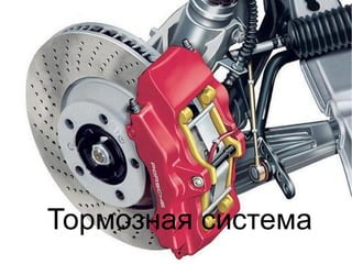 Документ описывает различные типы тормозных систем транспортных средств, включая рабочую, запасную и вспомогательную тормозные системы. Он объясняет, как каждая система регулирует скорость и обеспечивает остановку транспортного средства, а также упоминает механизмы, такие как усилители тормозов. Вспомогательная тормозная система предназначена для поддержания постоянной скорости на длинных спусках с помощью торможения двигателем.