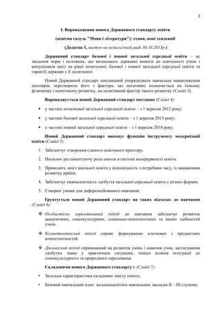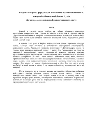 Новий державний стандарт орієнтує сучасного вчителя на особистісно зорієнтований, компетентісний та діяльнісний підходи до навчання, які забезпечать розвиток творчої людини. Бо саме така людина спроможна по-справжньому керувати своїм майбутнім, лише така особистість може впевнено подивитися в обличчя новизні. А це можливо лише за сприятливих умов навчання і виховання, тобто атмосфери успіху.