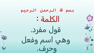 يتناول النص شرح مفردات اللغة العربية، بما في ذلك الاسم والفعل والحرف وأقسامهم، وكل ما يتعلق بإعرابها. يوضح أيضًا أنواع الأفعال (ماضٍ، مضارع، وأمر) وقواعد تصريفها ووزنها، ويستعرض أنواع الإعراب والعلامات الدالة على مختلف الأسماء. تم تناول كيف تُعتبر الألفاظ وتجميع الكلمة كمكونات أساسية في تركيب الجمل.