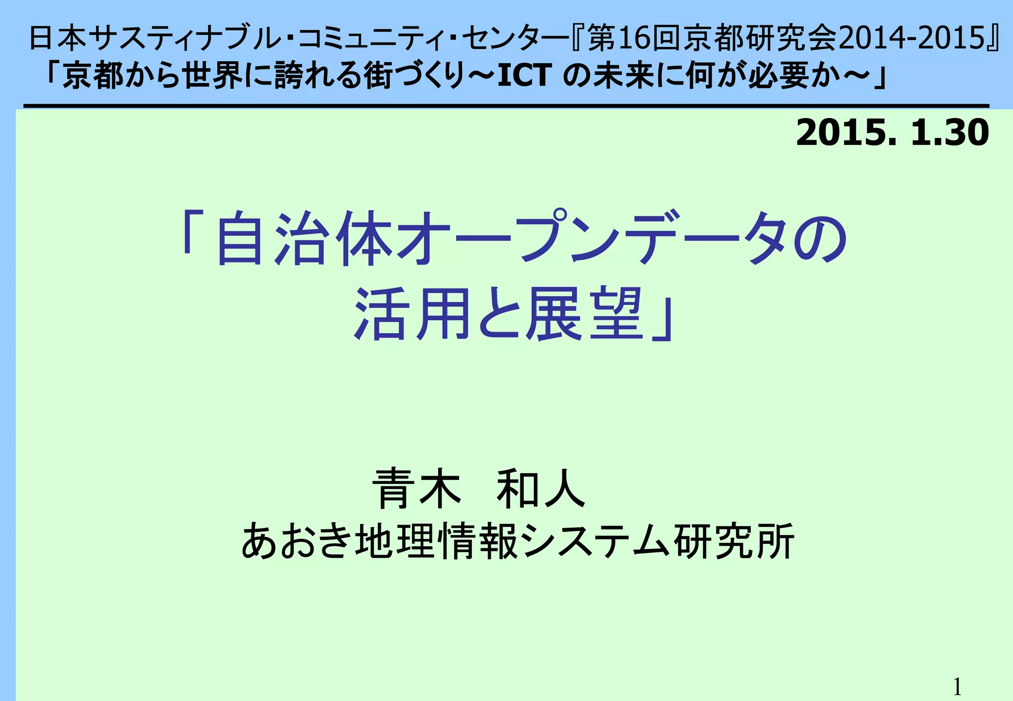 青木和人「自治体オープンデータの活用と展望」,特定非営利活動法人日本サスティナブル・コミュニティ・センター『第16回京都研究会2014-2015』, 「京都から世界に誇れる街づくり~ICT の未来に何が必要か~」,京都市国際交流会館イベントホール,2015年1月30日.