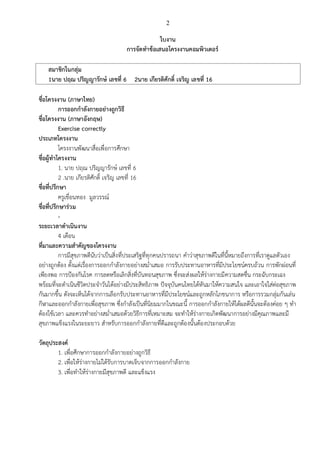 เลขที่ 6 2นาย เกียรติศักดิ์ เจริญ เลขที่ 16 ชื่อโครงงาน (ภาษาไทย) การออกกาลังกายอย่างถูกวิธี ชื่อโครงงาน (ภาษาอังกฤษ) Exercise correctly ประเภทโครงงาน โครงงานพัฒนาสื่อเพื่อการศึกษา ชื่อผู้ทาโครงงาน 1. นาย ปฤณ ปริญญารักษ์ เลขที่ 6 2 .นาย เกียรติศักดิ์ เจริญ เลขที่ 16 ชื่อที่ปรึกษา ครูเขื่อนทอง มูลวรรณ์ ชื่อที่ปรึกษาร่วม - ระยะเวลาดาเนินงาน 4 เดือน ที่มาและความสาคัญของโครงงาน การมีสุขภาพดีนับว่าเป็นสิ่งที่ประเสริฐที่ทุกคนปรารถนา คาว่าสุขภาพดีในที่นี้หมายถึงการที่เราดูแลตัวเอง อย่างถูกต้อง ตั้งแต่เรื่องการออกกาลังกายอย่างสม่าเสมอ การรับประทานอาหารที่มีประโยชน์ครบถ้วน การพักผ่อนที่ เพียงพอ การป้องกันโรค การลดหรือเลิกสิ่งที่บันทอนสุขภาพ ซึ่งจะส่งผลให้ร่างกายมีความสดชื่น กระฉับกระเฉง พร้อมที่จะดาเนินชีวิตประจาวันได้อย่างมีประสิทธิภาพ ปัจจุบันคนไทยได้หันมาให้ความสนใจ และเอาใจใส่ต่อสุขภาพ กันมากขึ้น ดังจะเห็นได้จากการเลือกรับประทานอาหารที่มีประโยชน์และถูกหลักโภชนาการ หรือการรวมกลุ่มกันเล่น กีฬาและออกกาลังกายเพื่อสุขภาพ ซึ่งกาลังเป็นที่นิยมมากในขณะนี้ การออกกาลังกายให้ได้ผลดีนั้นจะต้องค่อย ๆ ทา ต้องใช้เวลา และควรทาอย่างสม่าเสมอด้วยวิธีการที่เหมาะสม จะทาให้ร่างกายเกิดพัฒนาการอย่างมีคุณภาพและมี สุขภาพแข็งแรงในระยะยาว สาหรับการออกกาลังกายที่ดีและถูกต้องนั้นต้องประกอบด้วย วัตถุประสงค์ 1. เพื่อศึกษาการออกกาลังกายอย่างถูกวิธี 2. เพื่อให้ร่างกายไม่ได้รับการบาดเจ็บจากการออกกาลังกาย 3. เพื่อทาให้ร่างกายมีสุขภาพดี และแข็งแรง