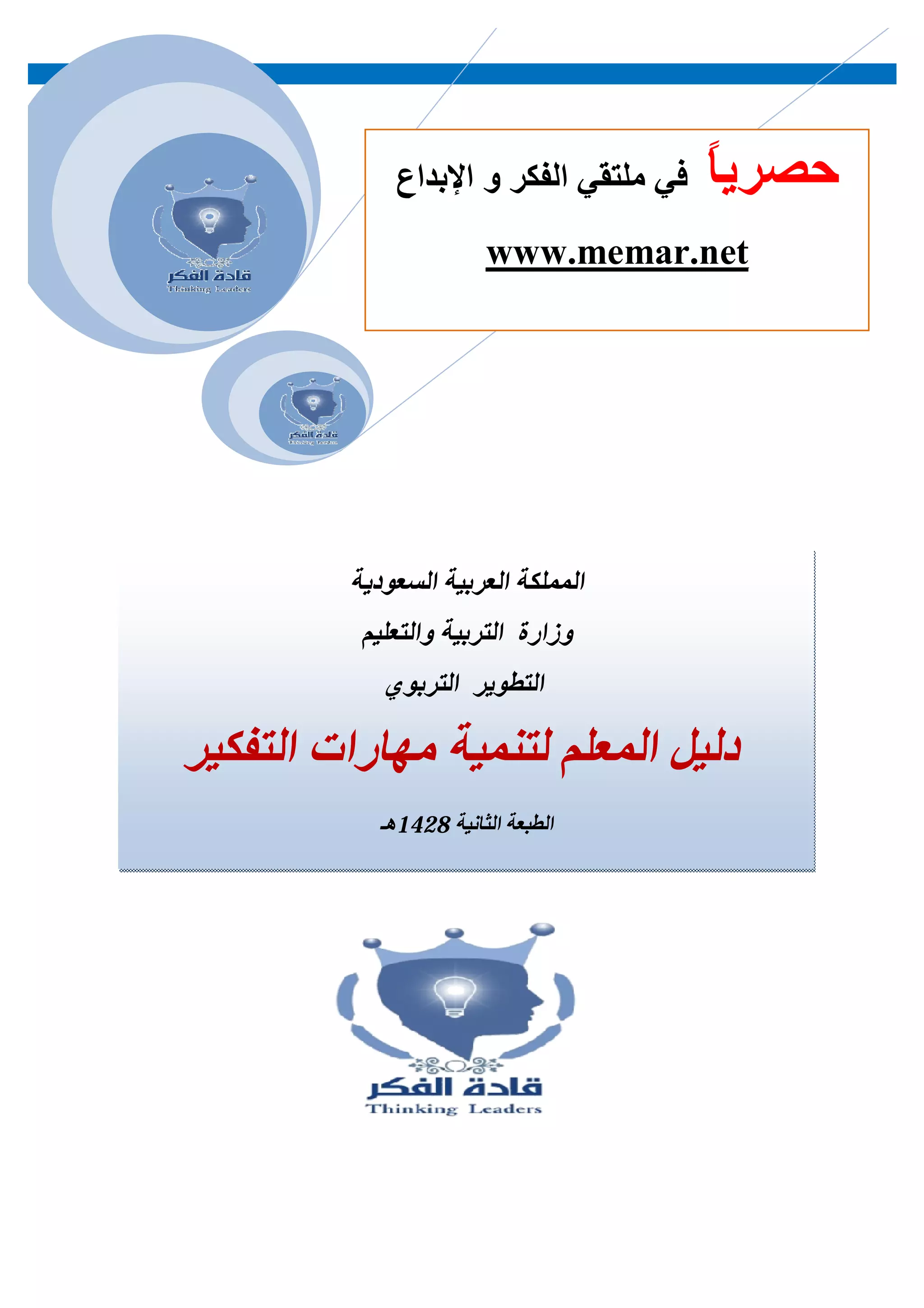 اﻟﺘﺮﺑﯿﺔ وزارة اﻟﺘﺮﺑﻮي اﻟﺘﻄﻮﯾﺮ اﻟﺘﻔﻜﯿﺮ ﻣﮭﺎرات ﻟﺘﻨﻤﯿﺔ اﻟﻤﻌﻠﻢ دﻟﯿﻞ اﻟﺜﺎﻧﯿﺔ اﻟﻄﺒﻌﺔ1428ھـ ًﺎﺣﺼﺮﯾﻣ ﻓﻲاﻹﺑﺪاع و اﻟﻔﻜﺮ ﻠﺘﻘﻲ www.memar.net