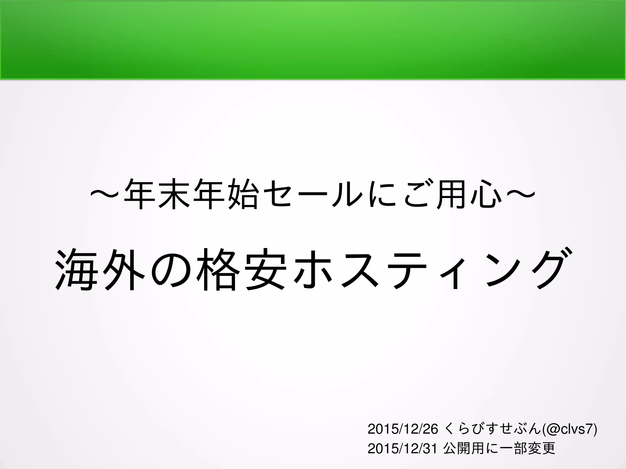 〜年末年始セールにご用心〜 海外の格安ホスティング 2015/12/26 くらびすせぶん(@clvs7) 2015/12/31 公開用に一部変更
