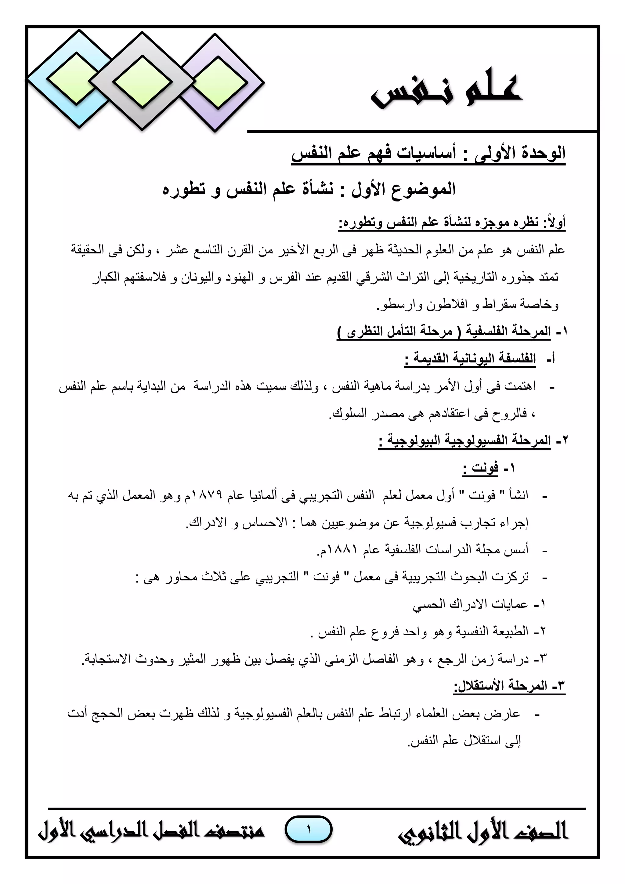 تناقش الوثيقة تطور علم النفس من جذوره الفلسفية في العصور القديمة إلى المدارس الحديثة التي تركز على سلوك الفرد ودوافعه. تستعرض أهم المراحل التاريخية والتوجهات في دراسة النفس وكيفية فهم السلوك البشري وتفسيره. يتناول النص أيضًا الأهداف الرئيسية لعلم النفس في فهم وتوقع وتوجيه سلوك الأفراد.
