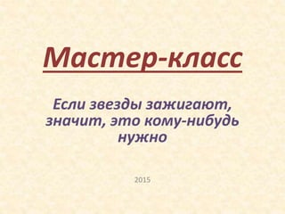 Документ описывает мастер-класс под названием 'Если звезды зажигают, значит, это кому-нибудь нужно', который проходит в королевстве АВС и включает использование 'волшебных чашей'. Упоминаются различные цвета и элементы, такие как 'музыкальная' и 'зеркало знаний'. Также присутствует аспект рефлексии, который подразумевает самоанализ.