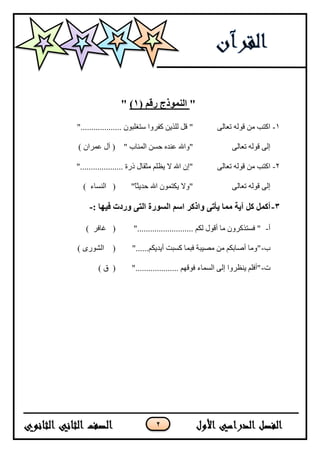 كزت"ُْبنك".................... ّسث صكشيب دعب ّقٕن ٗإنٗرعبن" اإلثكبس ٔ ٗثبنعش "ٔسجح) ٌعًشا آل ( 2-اٗرعبن ّقٕن ٍي كزتٔا اهلل ارقٕا آيُٕا ٍانزي "يأيٓبانٕسيهخ ّإني ثزغٕا"............... ٗإنّقٕنٗرعبنسحيى غفٕس اهلل ٌ"إ") انًبئذح ( 3-آيت كل أكملا و يأتى مما: فيها وردث التى السىرة اسم ذكر- 1-رشاة ٍي خهقكى ٌأ ّآيبر ٍ"ٔي".......................) انشٔو ( 2-سه نذأد "ْٔٔجُبٌيًب".......................) ص ( 3-قجهك ٍي أسسهُب ٍي "ٔسئم".......................)انضخشف ( 4-"فبإال ّإن ال َّأ عهىاهلل".......................) (يحًذ