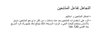 تناقش الوثيقة أهمية تفاعل الشركات على تويتر مع المتابعين، مشيرة إلى أهمية سرعة الرد على استفساراتهم التي يجب ألا تتجاوز 120 دقيقة. تُظهر نتائج الأبحاث أن 64% من الأشخاص يبحثون عن المعلومات حول المنتجات عبر تويتر قبل الشراء، مما underscores أهمية إدارة المحتوى بشكل فعّال. كما تقدم الوثيقة نصائح حول نسبة المحتوى التفاعلي والترويجي والتعليمي الذي يجب مراعاته لتحقيق نجاح أكبر على هذه المنصة.