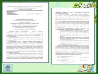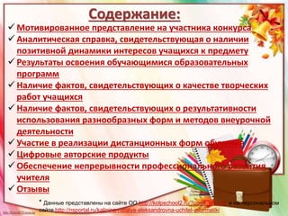 Документ представляет собой мотивированное представление учителя информатики Натальи Александровны Калининой к конкурсу, содержащий аналитику результатов учебной деятельности учащихся, факты об их творческих достижениях и участия в дистанционном обучении. В нем также указаны разработки элективных курсов, мониторинг учебных успехов и профессиональные достижения учителя. Основное внимание уделяется методам работы с учащимися, включая работу с детьми с ограниченными возможностями здоровья.