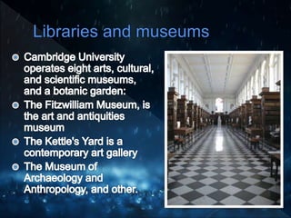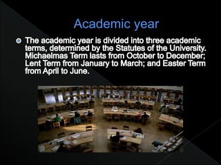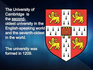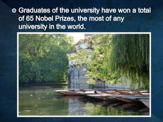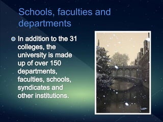 The document discusses the organizational structure of the University of Cambridge in the United Kingdom. It is divided into six schools - Arts and Humanities, Biological Sciences, Clinical Medicine, Humanities and Social Sciences, Physical Sciences, and Technology - which group related faculties and units together. Some famous historical figures who studied at Cambridge include Isaac Newton, Lord Byron, and Charles Darwin, and the great Russian scientist Ivan Pavlov received a toy dog as a gift from students during his time working there.