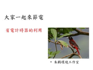 本文件介绍了朱鸝环境工作室的节电计时器利用活动,旨在通过讨论平台促进参与者的沟通和节电意识。活动包括节电计时器的发放、操作说明及经验分享,并鼓励社区居民注册参与。后续将维护讨论平台,持续分享节电相关信息,并组织相关活动。
