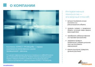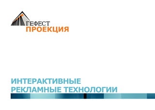 Компания «Гефест Проекция» является лидером на российском рынке проекционной рекламы, предлагая разнообразные интерактивные технологии для улучшения визуализации и вовлечения аудитории. В их ассортимент входят такие продукты, как голографические промоутеры, интерактивные столы и стены, а также проекционные витрины, которые позволяют компаниям выделяться и создавать уникальные рекламные решения. Компания является эксклюзивным производителем своей продукции и активно использует инновации для создания привлекательной рекламы.