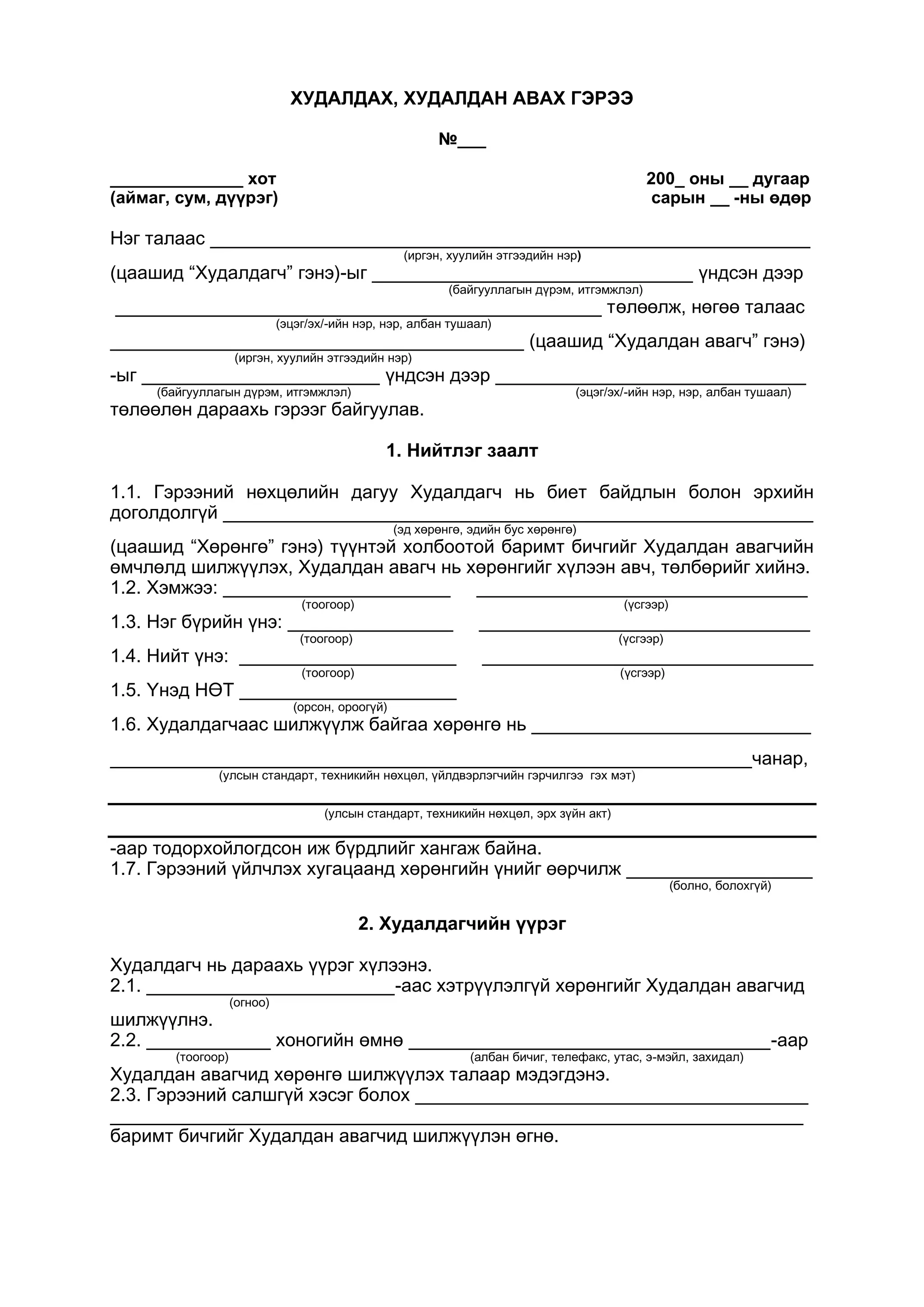 өдөр/ /үйлдсэн газар/ Гэрчилгээний дугаар _________________ Улсын бүртгэлийн дугаар _____________ Иргэний хуулийн 302.1 дэх хэсгийн заалтыг үндэслэн нэг талаас ____________________________________________________________-д оршин суух __________________ -ийн _________________ би /хөлслүүлэгч тал/, нөгөө талаас ____________________________________________________________-д оршин суух _________________ -ийн ___________________ /хөлслөгч тал/ бид харилцан тохиролцож, дараахь нөхцөлтэйгөөр энэхүү гэрээг байгуулав. Нэг. Нийтлэг үндэслэл 1. Хөлслүүлэгч __________________ нь хөлслөгч __________________-д өөрийн өмчлөлийн орон сууцаа _____ оны ____ сарын ____-ны өдрөөс _____ оны ____ сарын ____ -ны өдрийг хүртэл нийт ____ сар /жил/-ын хугацаагаар хөлслүүлнэ. 2. Орон сууц нь _________________________________ хаягт байрладаг, _________________ тоот орон сууц өмчлөх эрхийн гэрчилгээ, улсын бүртгэлийн __________________ дугаар бүхий, _______ м2 талбайтай, _______ өрөө бөгөөд хөлслүүлэгч __________________-ны өмч болох нь нотлогдсон болно. 3. Уг орон сууц нь битүүмжлэгдээгүй, аль нэг байгууллага, иргэнд худалдагдаагүй, барьцаалагдаагүй, түрээслүүлээгүй болно. 4. Иргэний хуулийн 288.2.3, 289.2.3-т заасан тохиолдолд гэрээг хугацаанаас нь өмнө цуцалж болно. 5. Хөлслөгч орон сууц хөлслөсний төлбөрийг сар бүр, улирал, хагас жил, бүтэн жилээр /алин болохыг доогуур нь зурах/ төлөх бөгөөд нийт төлбөр ___________ /тоогоор/ _________________________________________ /үсгээр/ төгрөг байна. 6. Орон сууцыг тавилга, бусад эд хогшлын хамт хөлслүүлж байгаа нөхцөлд “Хүлээлцэх акт“ үйлдэн талууд гарын үсэг зурж, гэрээнд хавсаргана. ___________________________________________________________________ /тавилга, бусад эд хогшлын хамт хөлслүүлж буй эсэхээ тэмдэглэх/ Хоёр. Хөлслүүлэгчийн эрх, үүрэг 1. Хөлслүүлэгч нь ашиглалтын шаардлага хангасан, биет байдлын болон эрхийн доголдолгүй орон сууцыг хөлслөгчийн эзэмшил, ашиглалтад _____ оны ____ дугаар сарын ____ -ны өдөр хүлээлгэн өгнө. 2. Хөлслүүлэгч хөлслөгчөөс орон сууц хөлсөлсний төлбөрийг гэрээнд заасан хугацаанд төлөхийг шаардах эрхтэй. 3. Хөлслүүлэгч Иргэний хуулийн 288.2.3-т зааснаар хугацаанаас өмнө гэрээг цуцлахаар бол 1 сараас багагүй хугацааны өмнө хөлслөгчид мэдэгдэнэ. 4. Гэрээнд өөрөөр заагаагүй бол хөлслүүлэгч орон сууцны засвар, үйлчилгээг өөрийн хөрөнгөөр хийнэ. 5. Иргэний хуулийн 288 дугаар зүйлд заасан бусад эрх, үүрэг. Гурав. Хөлслөгчийн эрх, үүрэг 1. Хөлслөгч хөлслөн авсан орон сууцыг гэрээнд заасан нөхцөл, зориулалтаар нь ашиглаж, түүний бүрэн бүтэн байдлыг хангана. Хөлслөгч орон