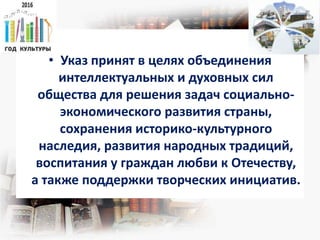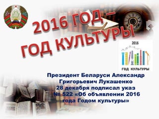 28 декабря 2015 года президент Беларуси Александр Лукашенко подписал указ о том, что 2016 год будет годом культуры, направленным на популяризацию белорусского искусства и поддержку национальных традиций. В этом году запланированы мероприятия, приуроченные к значимым юбилеям в культурной сфере, а также принятие нового кодекса о культуре. Основное внимание будет уделено художественной культуре как средству воспитания патриотизма у молодежи.