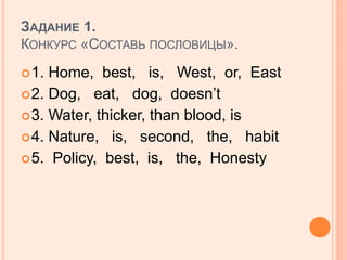 Документ содержит задания для конкурса по английским пословицам и поговоркам, включая составление, дополнение и соотнесение пословиц. Учащиеся должны также проиллюстрировать пословицы и расшифровать их значения. Документ направлен на развитие навыков работы с пословицами на английском языке.