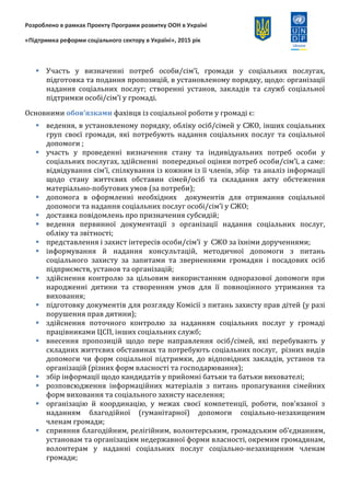 Проект Посадової інструкції фахівця із соціальної роботи відділу організації надання соціальних послуг у громаді розроблена з метою відпрацювання моделі діяльності Центру соціальних послуг та визначає функціональні обов’язки, права та відповідальність фахівця із соціальної роботи. Проект документу містить також інформацію про основні завдання та обов’язки фахівця із соціальної роботи, сферу відповідальності. Крім того при розробці документі враховано напрямок взаємовідносин фахівця на посаді з іншими фахівцями у соціальному напрямку, працівниками структурних підрозділів ЦСП, підприємств та установ всіх форм власності й господарювання.