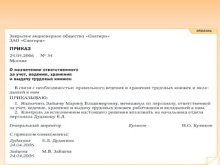 Документ содержит инструкции по проведению аудита трудовых книжек (ТК), включая способы выявления ошибок и недействительных записей. Описываются этапы аудита, методы документального оформления, а также рекомендации по исправлению неаккуратностей и фиксации изменений. На примерах различных образцов ТК приводятся защитные знаки и правила их оформления.