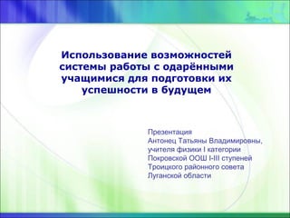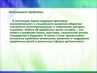 Документ описывает важность работы с одарёнными детьми для их успешности в будущем, акцентируя внимание на выявлении, развитии и поддержке их талантов. Приводится модель системы работы, включающая индивидуальный подход и проектное обучение, способствующее развитию креативных умений и социальной адаптации. Упоминаются успешные примеры участия учащихся в конкурсах и олимпиадах, подтверждающие эффективность данной системы.