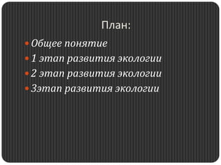 Документ представляет собой самостоятельную работу студентки китаеведения по истории развития экологии, охватывающую три основных этапа: 1) зарождение и становление экологии как науки, 2) оформление экологии в самостоятельную отрасль знаний и 3) превращение экологии в комплексную науку. Работа включает анализ ключевых ученых и их вкладов в развитие экологии, а также законодательные действия по охране природы в России. Основное внимание уделяется влиянию человека на природу и важности экологических подходов в решении возникающих проблем.