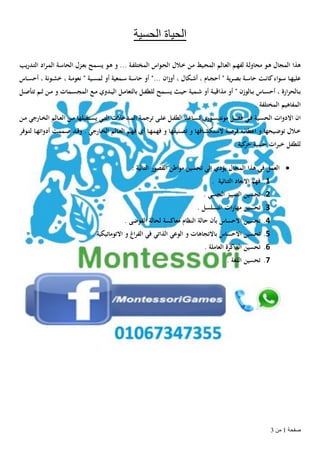 المستند يصف مجموعة من الأنشطة التعليمية لتنمية المهارات الحسية للأطفال، بما في ذلك التنسيق بين الألوان والأشكال والأحجام. يتناول أيضًا تمارين حسية متنوعة مثل تمييز الأشكال والأدوات الصوتية والعطور. الأنشطة تشمل المضاهاة واستخدام مواد مختلفة لتطوير الحواس بأساليب شيقة.