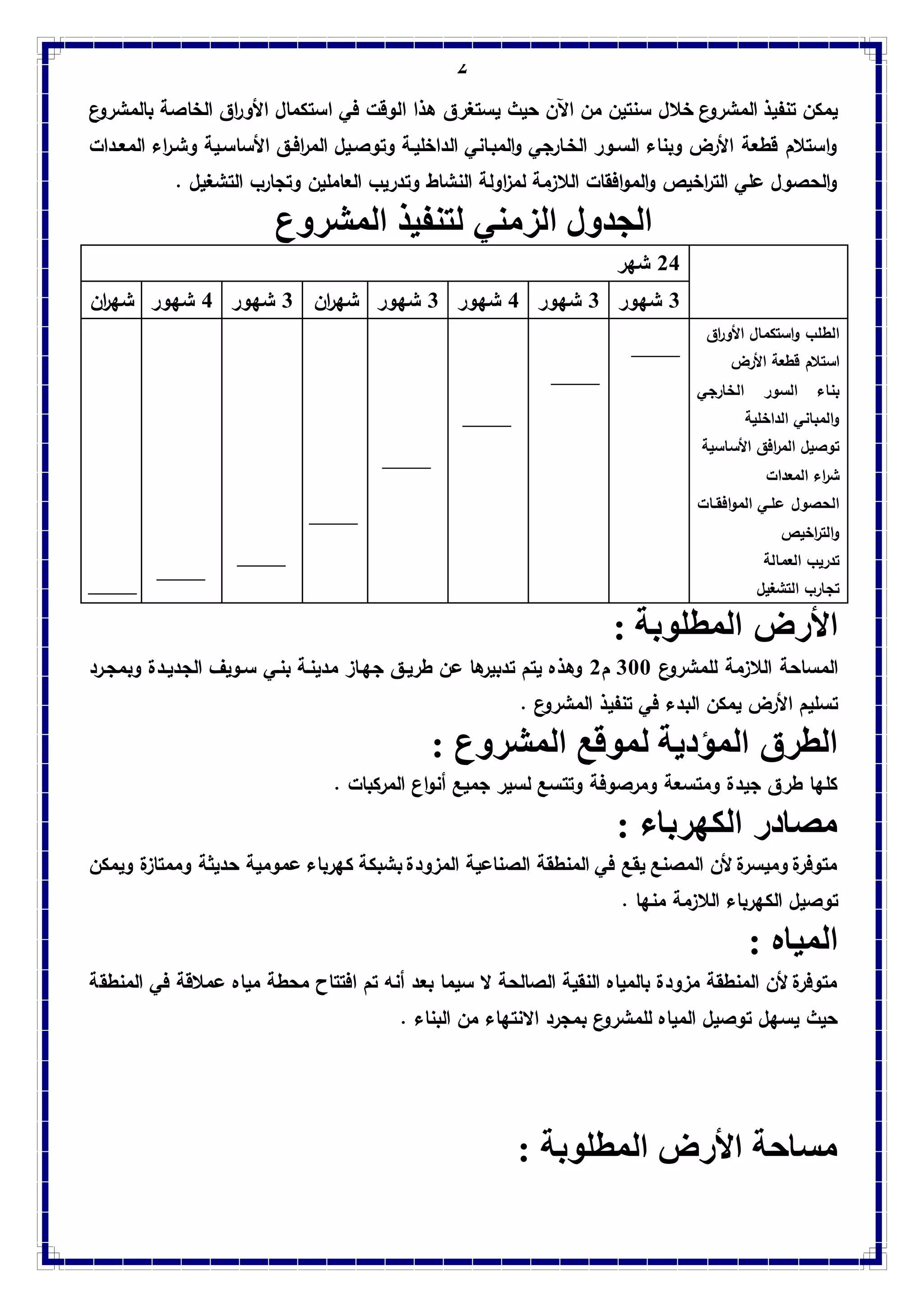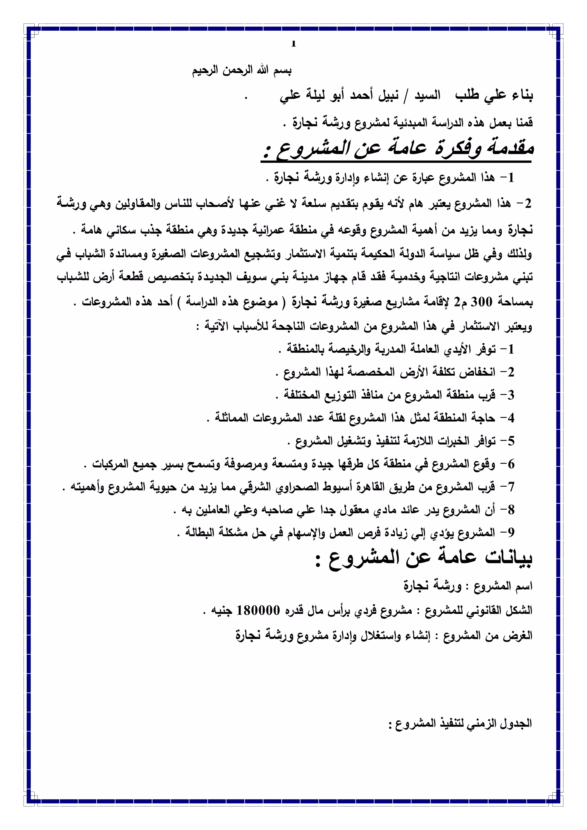 تتعلق الوثيقة بمشروع ورشة صغيرة مخصصة لخلق فرص عمل وتقديم تدريب للشباب في منطقة جديدة. يهدف المشروع إلى تشجيع الاستثمار والمساعدة في تقليل البطالة من خلال توفير فرص عمل مدربة بتكاليف منخفضة. ويقترح المشروع تدابير تشغيلية محددة تتضمن تنفيذ الجدول الزمني واستكمال البنية التحتية اللازمة.