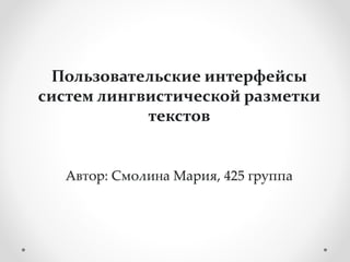 Документ описывает системы лингвистической разметки текстов, их виды, стандарты и этапы разметки. Основное внимание уделяется автоматическим и ручным инструментам, поддерживающим различные типы разметки, включая графематическую и морфологическую. Также рассматриваются существующие системы и требования к ним, с акцентом на необходимость разработки инструментов для работы с русскоязычными текстами.