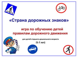 Документ описывает игру «страна дорожных знаков», предназначенную для обучения детей правилам дорожного движения в возрасте 5-7 лет. В игре дети выполняют различные задания, связанные с распознаванием дорожных знаков и правильным поведением на дороге. Игровой процесс включает в себя оценку знаний и присвоение званий, направленных на развитие внимательности и безопасности на дороге.