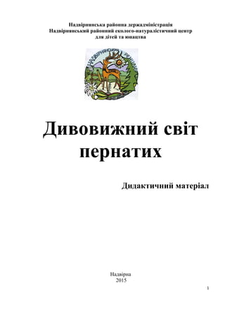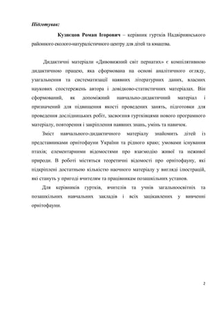 Дидактичні матеріали «Дивовижний світ пернатих» є компілятивною дидактичною працею, яка сформована на основі аналітичного огляду, узагальнення та систематизації наявних літературних даних, власних наукових спостережень автора і довідково-статистичних матеріалах. Він сформований, як допоміжний навчально-дидактичний матеріал і призначений для підвищення якості проведених занять, підготовки для проведення дослідницьких робіт, засвоєння гуртківцями нового програмного матеріалу, повторення і закріплення наявних знань, умінь та навичок.