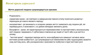 • "життєві кризи" - перехідні періоди життя, коли відбувається ламання і активна зміна