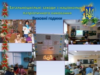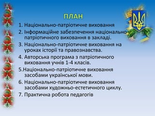 1. Національно-патріотичне виховання 2.Інформаційне забезпечення національно- патріотичного виховання в закладі. 3. Національно-патріотичне виховання на уроках історії та правознавства. 4. Авторська програма з патріотичного виховання учнів 1-4 класів. 5.Національно-патріотичне виховання засобами української мови. 6. Національно-патріотичне виховання засобами художньо-естетичного циклу. 7. Практична робота педагогів