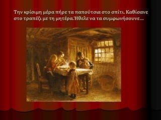 …. Εκείνο το βράδυ ο μικρός τσαγκάρης μίλησε της μάνας του κι εκείνη