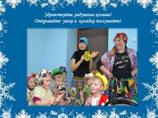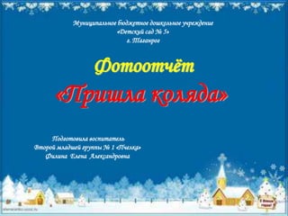Документ представляет собой фотоотчет о мероприятии «Пришла коляда», подготовленный воспитателем детского сада No 5 г. Таганрог. В отчете описывается радостное приветствие кулиси и праздничные пожелания в честь коляды. Упоминается атмосфера веселья и ожидание сладостей для гостей.