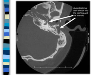 хальс цоорч, хэнгэргэн хөндийд идээ дүүрч сонсголын яснууд идэгдэж, хөдөлгөөн нь муудсантай холбоотойгоор сонсгол 20-80 дБ хүртэл буурна.