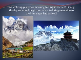 The travelers woke up excited to begin their two-day trekking excursion in the Himalayas, which involved a small plane and hours of hiking up and down rocky mountain trails under the hot sun. They reached the village of Phakding where they camped and tried local dishes. The next day, they awoke to an amazing sunrise and took a walk down to the river, where they met two friendly local boys, seeing how impoverished yet happy the mountain villages were.