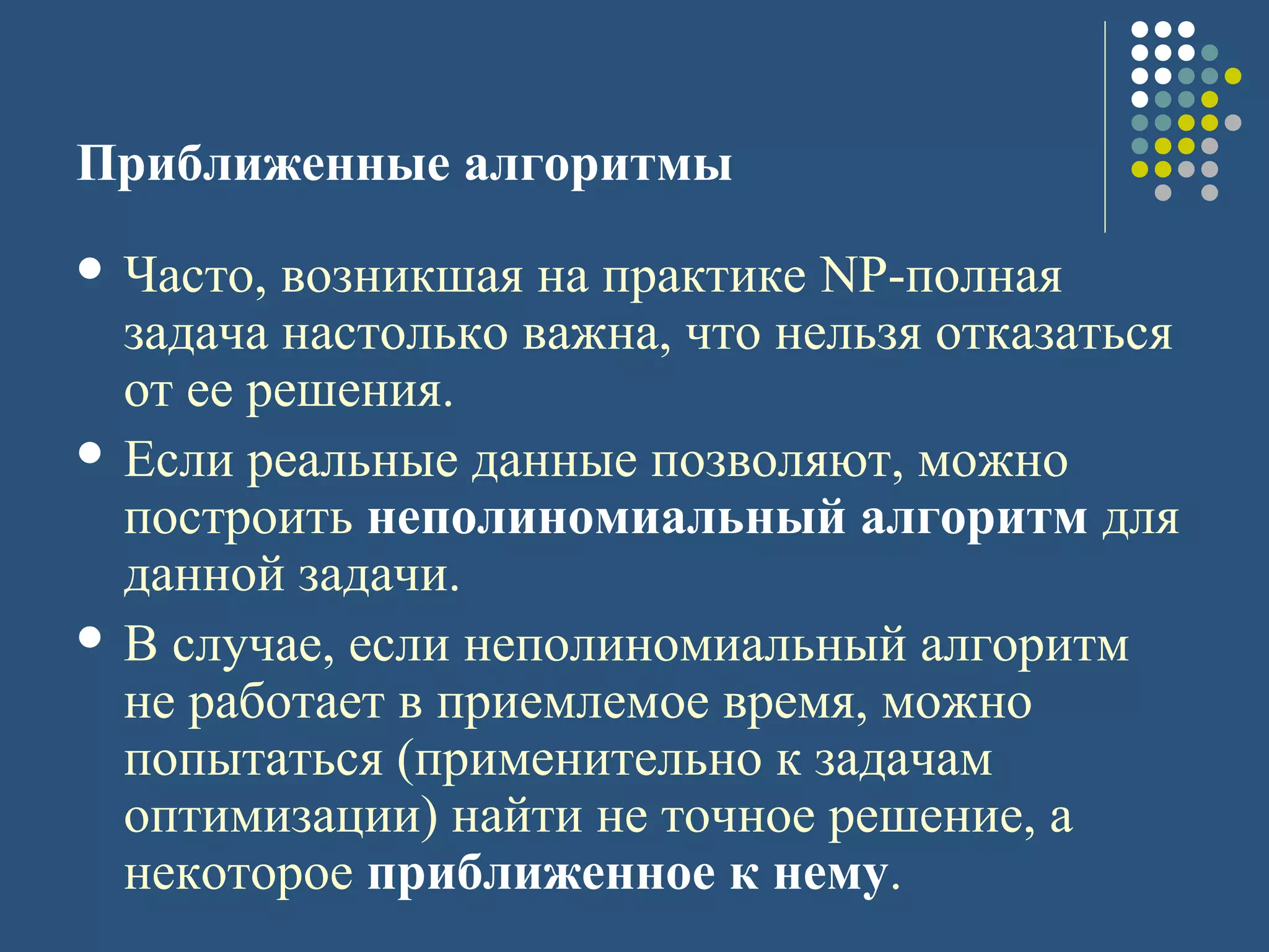 Документ представляет анализ комбинаторных алгоритмов, уделяя внимание приближенным алгоритмам для решения NP-полных задач. Обсуждаются методы оценки качества алгоритмов, такие как относительная ошибка, и приводятся примеры задач, включая задачу о вершинном покрытии и задачу коммивояжера с описанием алгоритмов для их решения. Также рассмотрены техники, позволяющие получать полиномиальные схемы приближения для задачи о суммах подмножеств.