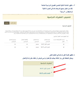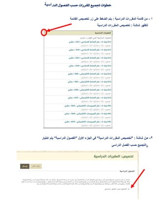 يتناول المستند خطوات تخصيص قائمة المقررات الدراسية حسب الفصول الرئيسية. يبدأ بفتح الشاشة الخاصة بالمقررات الدراسية واختيار الفصل المرغوب، ثم يعرض خيارات متاحة لتأكيد الاختيار وإرسال البيانات. يحتوي أيضًا على توجيهات حول كيفية إظهار أو إخفاء المقررات الخاصة بكل فصل.