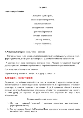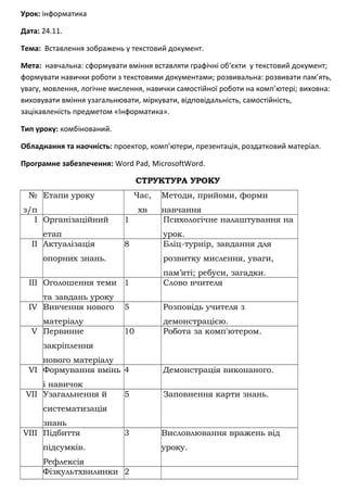 Мета: сформувати вміння вставляти графічні об’єкти у текстовий документ; формувати навички роботи з текстовими документами; розвивальна: розвивати пам’ять, увагу, мовлення, логічне мислення, навички самостійної роботи на комп’ютері; виховна: виховувати вміння узагальнювати, міркувати, відповідальність, самостійність, зацікавленість предметом «Інформатика».
