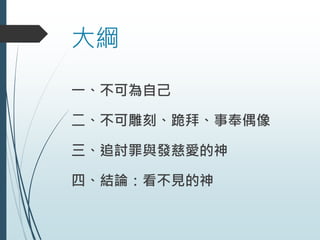 此文档讨论了基督徒应当遵循的第二条诫命:不可为自己雕刻偶像、跪拜或事奉。强调只有信靠真神,才能避免偶像化的陷阱,且神的恩典远大于对罪的追讨。最终,信徒需以神的旨意为重,捨己跟随,享受神所赐的真正自由。