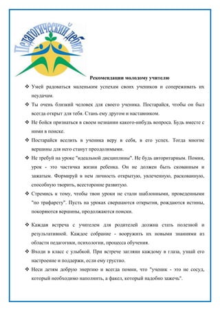 Документ содержит рекомендации для молодых учителей по ведению уроков и взаимодействию с учениками. Он акцентирует внимание на важности создания поддерживающей атмосферы, заинтересованности учеников в обучении и формировании их личности. Кроме того, документ предлагает стратегии подготовки уроков, включая определение тематической цели, подбор учебного материала и организацию занятий.