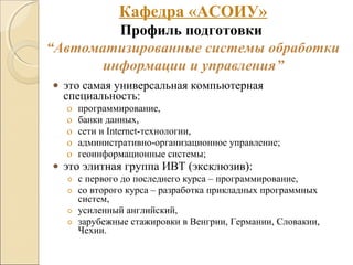 Документ описывает кафедру «Автоматизированные системы обработки информации и управления» Ижевского государственного технического университета, предлагающую обучение по направлениям информатики и вычислительной техники. Программа включает изучение программирования, разработки программных систем и проектирования, а также предоставляет возможности для зарубежных стажировок и научно-исследовательской работы. Выпускники могут работать в различных сферах, включая дизайн, информационные технологии и наукоемкие проекты.