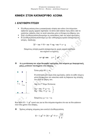 άξονα Μαπγαπίτα Τσόντος – Φςσικόρ - efysikimou.blogspot.gr 1 ΚΙΝΗΣΗ ΣΤΟΝ ΚΑΤΑΚΟΡΥΦΟ ΑΞΟΝΑ Ι. ΕΛΕΤΘΕΡΗ ΠΣΩΗ Διεύζεξε πηώζε είλαη ε θαηαθόξπθε θίλεζε πνπ θάλεη έλα ζώκα πνπ αθήλεηαη (ρσξίο αξρηθή ηαρύηεηα) λα πέζεη από θάπνην ύςνο πάλσ από ην νξηδόληην επίπεδν, όηαλ ζε απηό αζθείηαη κόλν ε δύλακε ηνπ βάξνπο ηνπ. Σηελ ειεύζεξε πηώζε ζεσξνύκε ηηο αληηζηάζεηο από ηνλ αέξα ακειεηέεο. Η ειεύζεξε πηώζε ηζνδπλακεί κε ηελ επζύγξακκε νκαιά επηηαρπλόκελε θίλεζε. Απόδεημε: ΣF = mα Β = mα mg =mα α = g Δπνκέλσο θίλεζε νκαιά επηηαρπλόκελε ρσξίο αξρηθή ηαρύηεηα θαη ηζρύνπλ νη ζρέζεηο: u = gt και y = 2 1 gt2 Αν η ανηίζηαζη ηοσ αέρα θεωρηθεί αμεληηέα, δύο ζώμαηα με διαθορεηικές μάζες, θηάνοσν ηασηότρονα ζηο έδαθος. Έζησ κάδα Μ >> m. Η αληίζηαζε ηνπ αέξα είλαη ακειεηέα, νπόηε ζε θάζε ζώκα ε κόλε δύλακε πνπ ηνπ αζθείηαη θαηά ηε δηάξθεηα ηεο θίλεζήο ηνπ είλαη ην βάξνο ηνπ. Από ην 2ν Νόκν Νεύησλα: mg = mα1 g = α1 Mg = Mα2 g = α2 Δπνκέλσο: g = α1 = α2 Καη αθνύ Η = ½ gt2 θνηλό θαη γηα ηα δύν ζώκαηα ζεκαίλεη όηη θαη ηα δύν θηάλνπλ ζηνλ ίδην ρξόλν ζην έδαθνο. Χξόλνο θίλεζεο ζώκαηνο πνπ εθηειεί ειεύζεξε πηώζε Η = ½ gt2 2H = gt2 t = g H2